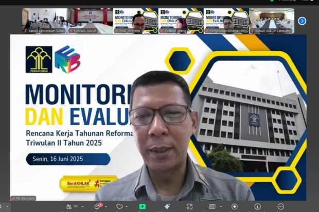 Kantor Wilayah Kementerian Hukum Sulawesi Selatan turut berpartisipasi dalam Monitoring dan Evaluasi Rencana Kerja Tahunan Reformasi Birokrasi Triwulan II Tahun 2025 yang diselenggarakan secara daring pada Senin (16/6/2025).